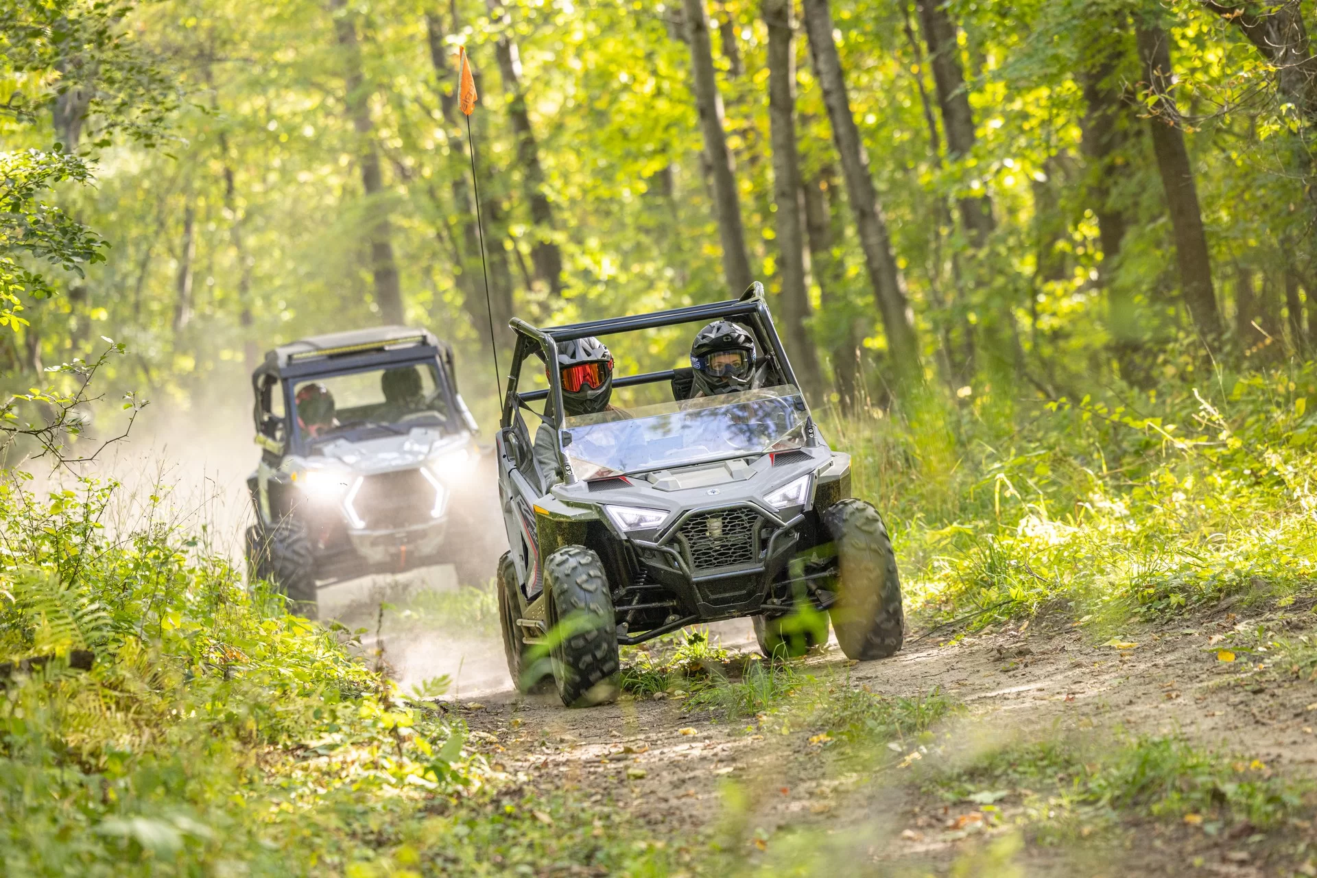 LED světlomety a zadní světla poskytují jezdcům lepší viditelnost. Součástí výbavy je jasně viditelná vlajka.